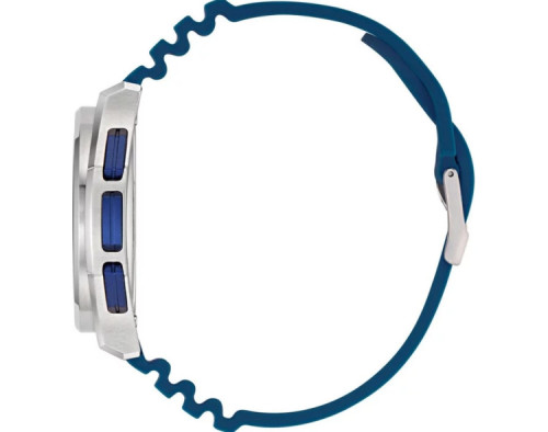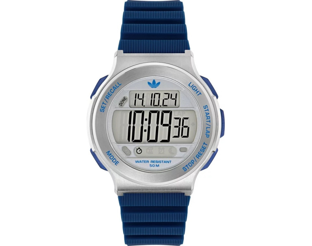Kvarcas Unisex Rankinis laikrodis Adidas AOFH25508 su Nerūdijantis plienas dėklu, 44 mm skersmens, Mineralinis stiklas, LCD ciferblatu ir Mėlyna Silikonas apyranke.
