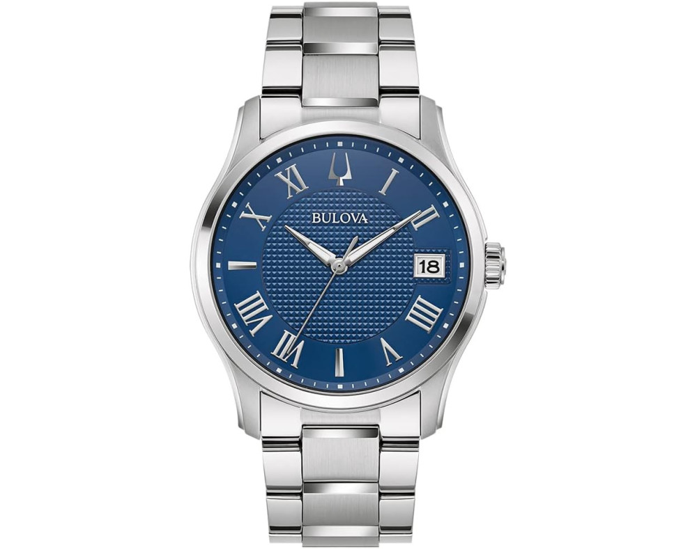 Kvarcas Vyras Rankinis laikrodis Bulova 96B386 su Nerūdijantis plienas dėklu, 41 mm skersmens, Mineralinis stiklas, Mėlyna ciferblatu ir Sidabras Nerūdijantis plienas apyranke.