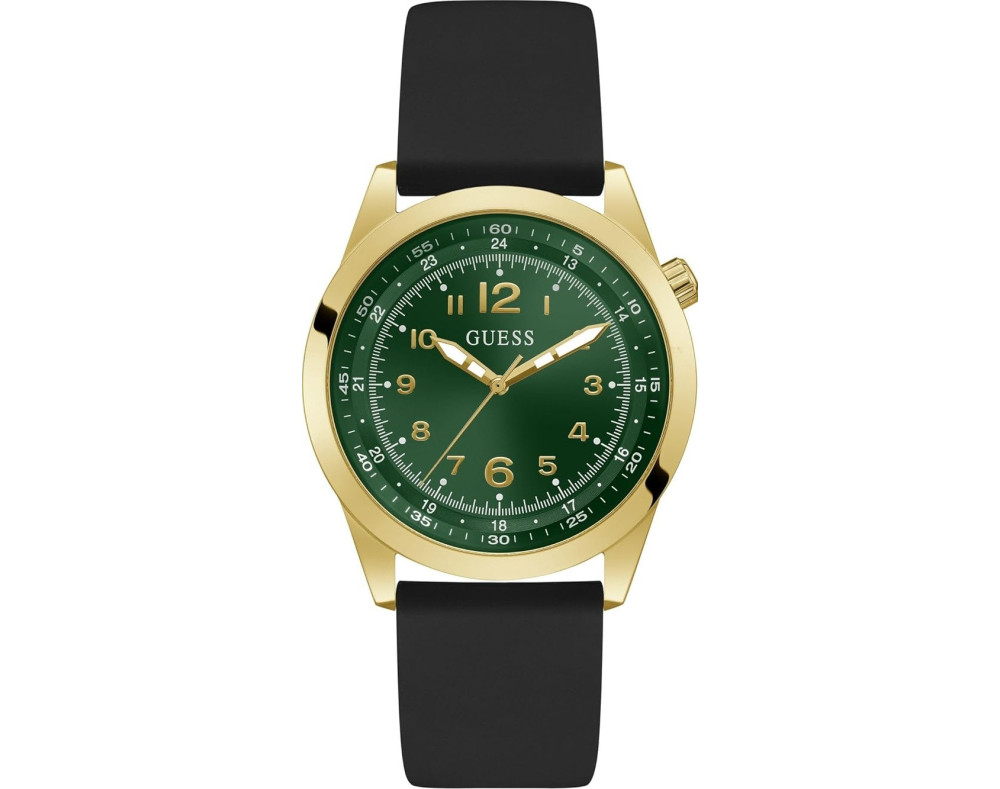 Kvarcas Vyras Rankinis laikrodis Guess GW0494G4 su Nerūdijantis plienas dėklu, 42 mm skersmens, Mineralinis stiklas, Žalias ciferblatu ir Juoda Silikonas apyranke.