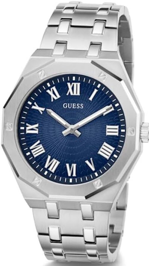 Kvarcs Cilvēks Rokas pulkstenis Guess GW0575G4 ar Nerūsējošais tērauds korpusu, ar diametru 43 mm, Minerāls stikls, Zils ciparnīcu un Sudrabs Nerūsējošais tērauds siksnu.