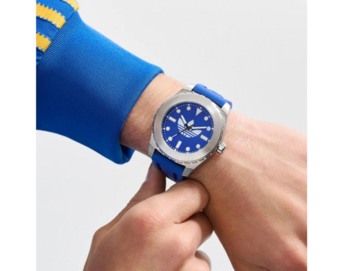 Kvarcs Unisex Rokas pulkstenis Adidas AOSY25020 ar Nerūsējošais tērauds korpusu, ar diametru 44 mm, Minerāls stikls, Zils ciparnīcu un Zils Silikona siksnu.