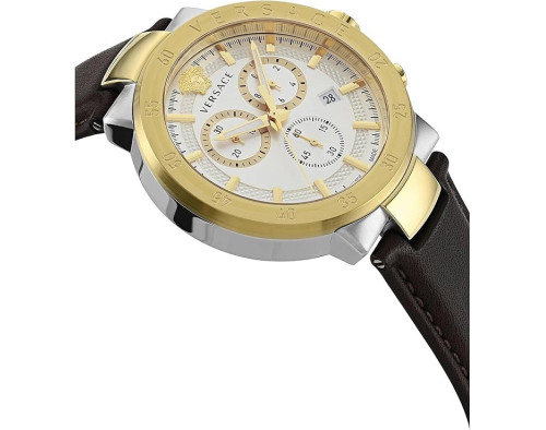 Кварц Мужчина Наручные часы Versace VEPY00220, корпус Нержавеющая сталь, диаметр 43 mm, Минерал с обработкой сапфиром стекло, Серебро циферблат и Коричневый Кожа ремешок.