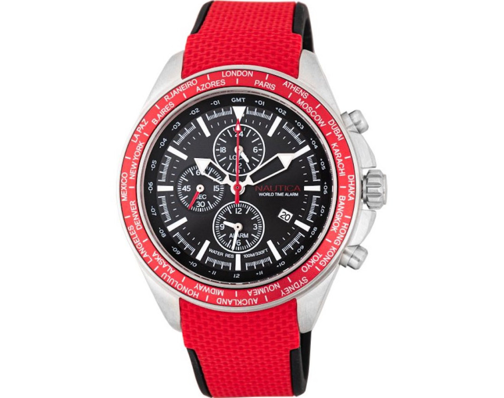 Кварц Мужчина Наручные часы Nautica NAPOBP901, корпус Нержавеющая сталь, диаметр 46 mm, Минеральная стекло, Черный циферблат и Красный Силикон ремешок.