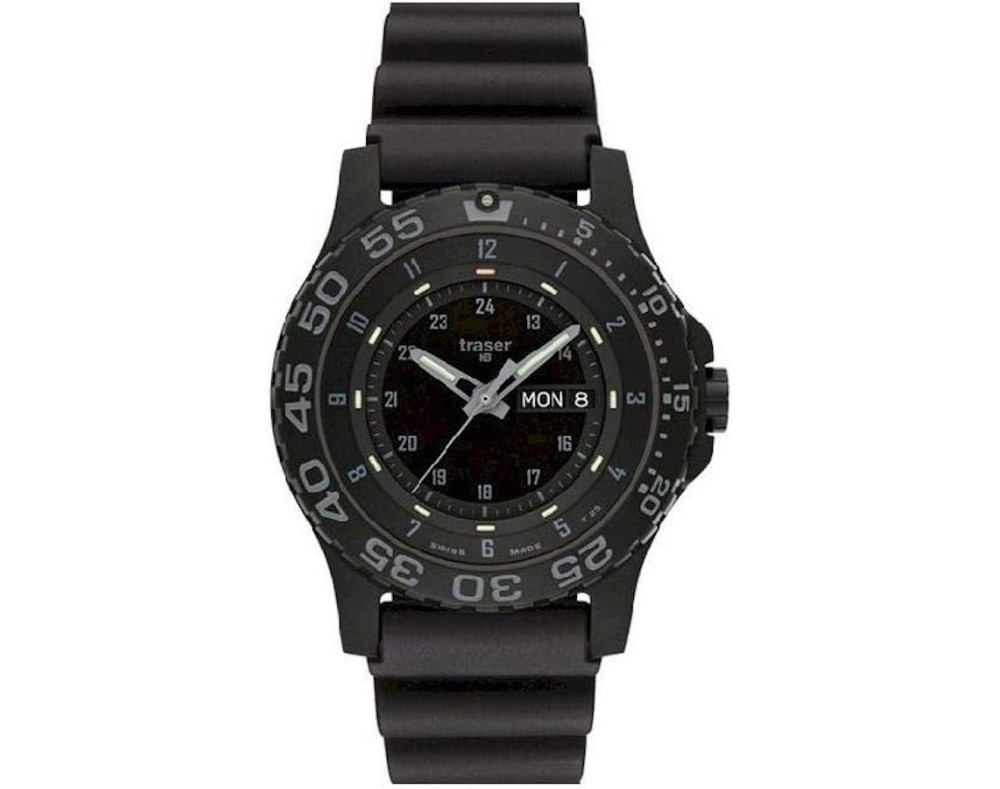 Кварц Мужчина Наручные часы Traser 104207, корпус Нержавеющая сталь, диаметр 45 mm, Минерал с обработкой сапфиром стекло, Черный циферблат и Черный Ластик ремешок.