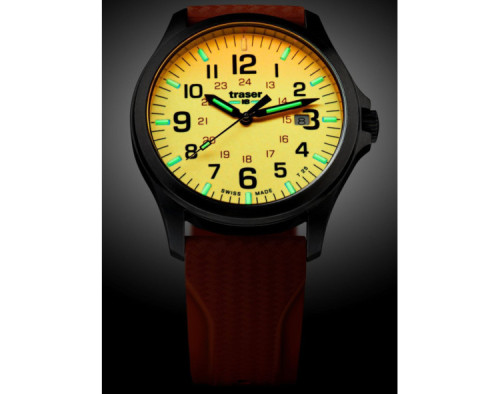 Кварц Мужчина Наручные часы Traser 107423, корпус Нержавеющая сталь, диаметр 42 mm, Минерал с обработкой сапфиром стекло, Апельсин циферблат и Апельсин Ластик ремешок.