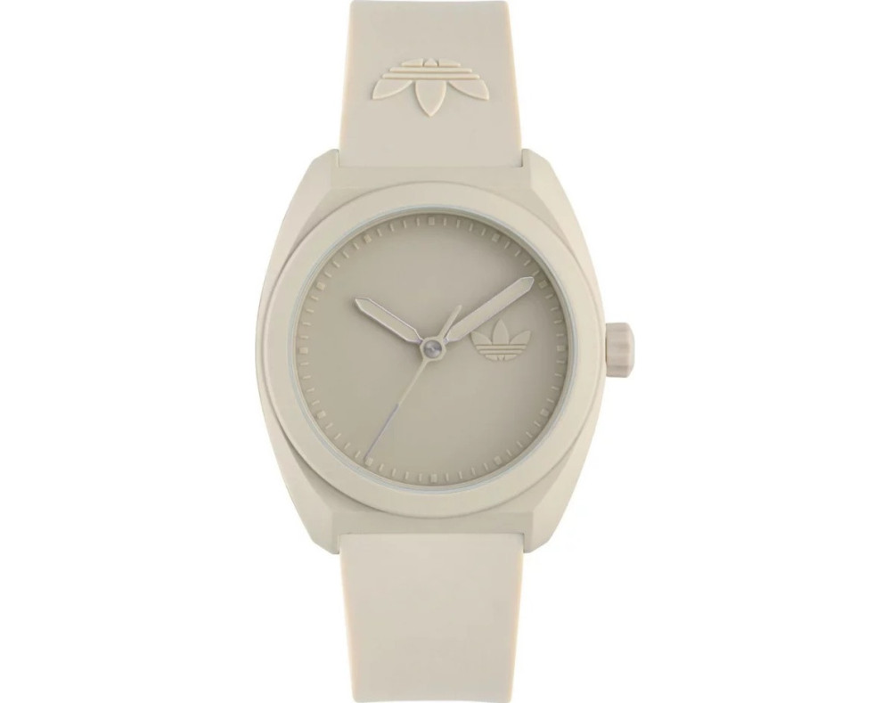 Armbanduhr Adidas Project Three AOST24055 für Unisex mit Quarzwerk, Uhrengehäuse aus Keramik mit einem Durchmesser von 42 mm, Ziffernblatt Beige und Uhrenarmband aus Silikon in der Farbe Beige.