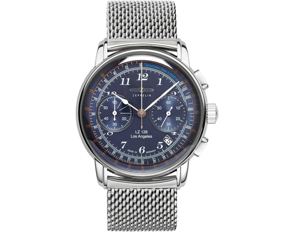Armbanduhr Zeppelin LZ126 Los Angeles 7614M-3 für Herren mit Quarzwerk, Uhrengehäuse aus Edelstahl mit einem Durchmesser von 42 mm, Ziffernblatt Blau und Uhrenarmband aus Edelstahl in der Farbe Silber.