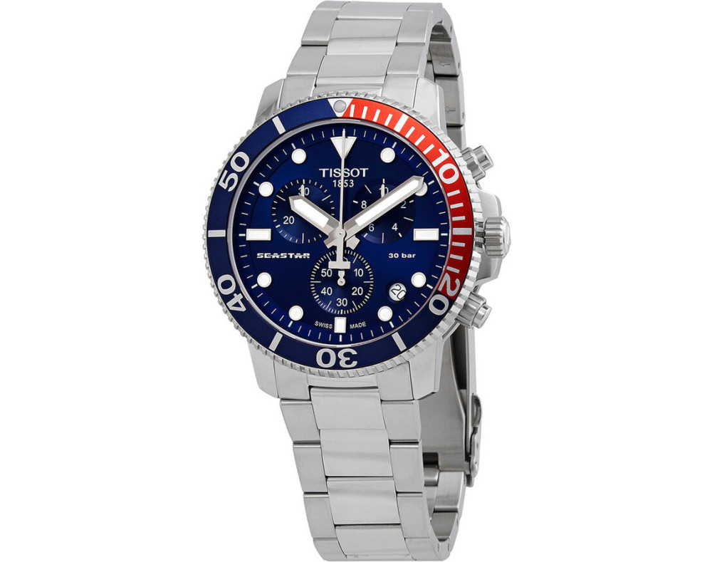 Reloj de pulsera Tissot Seastar T120.417.11.041.03 para Hombre con movimento de Cuarzo, con caja de Acero inoxidable con diàmetro de 46 mm, con cuadrante Azul y correa en Acero inoxidable, color Plateado.