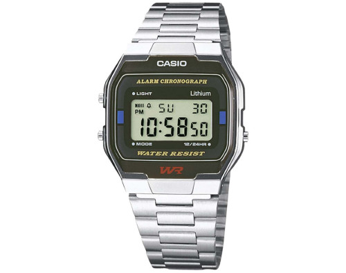 Montre bracelet Casio Retro Vintage A163WA-1Q pour Mixte à Quartz, avec une boîtier de Résine d’un diamètre de 33 mm, avec un cadran Noir et avec un bracelet de Acier inoxydable en couleur Argent.