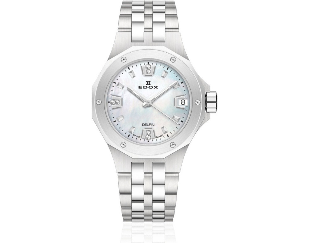 Montre bracelet EDOX Delfin The Original 53100 3M NAND pour Femme à Quartz, avec une boîtier de Acier inoxydable d’un diamètre de 33 mm, avec un cadran Nacre et avec un bracelet de Acier inoxydable en couleur Argent.