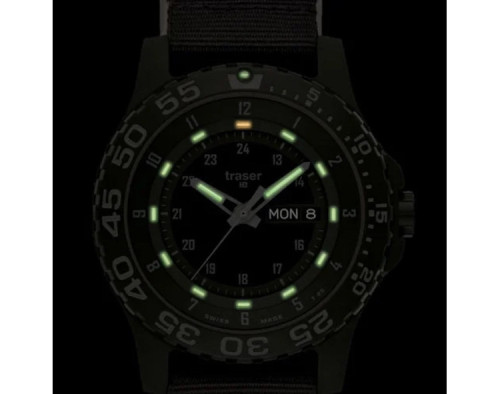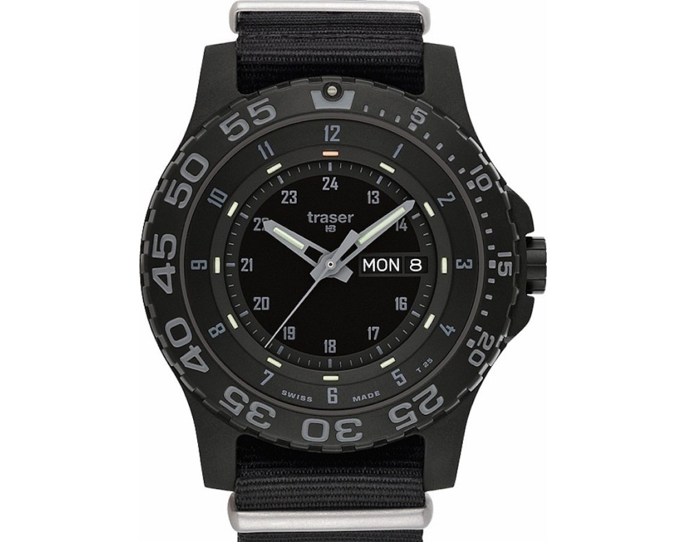 Montre bracelet Traser 103353 pour Homme à Quartz, avec une boîtier de Acier inoxydable d’un diamètre de 45 mm, avec un cadran Noir et avec un bracelet de Tissu en couleur Noir.