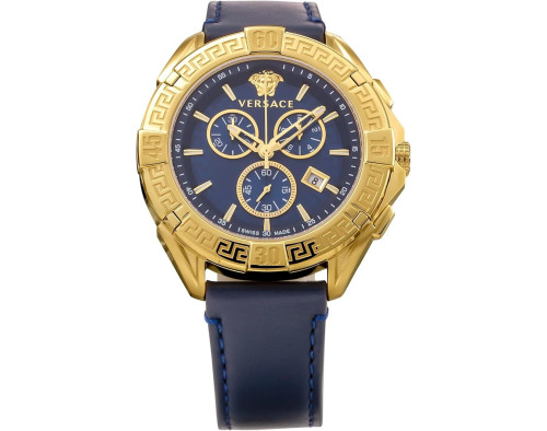 Montre bracelet Versace Chrono Sporty VE5CA0223 pour Homme à Quartz, avec une boîtier de Acier inoxydable d’un diamètre de 46 mm, avec un cadran Bleu et avec un bracelet de Cuir en couleur Bleu.
