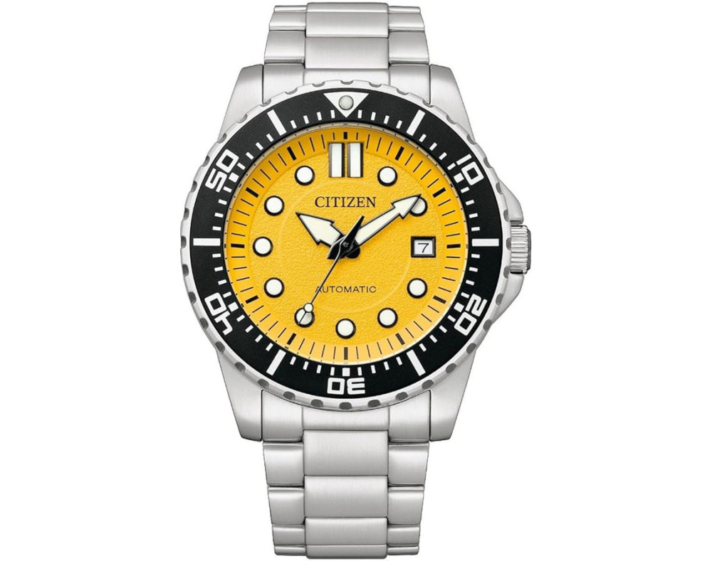 Montre bracelet Citizen NJ0170-83Z pour Homme à Mécanique, avec une boîtier de Acier inoxydable d’un diamètre de 43 mm, avec un cadran Jaune et avec un bracelet de Acier inoxydable en couleur Argent.