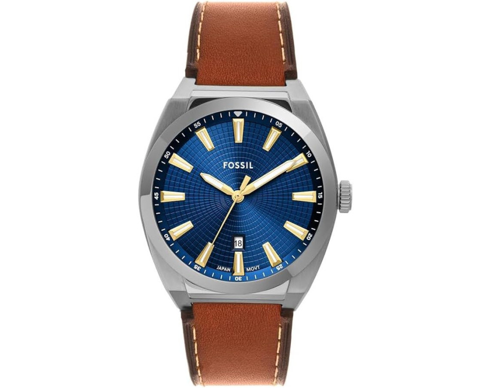 Quartz Man Wristwatch Fossil Everett FS6115 with Stainless steel case, with diameter 42 mm, Blue dial and Brown Leather band.