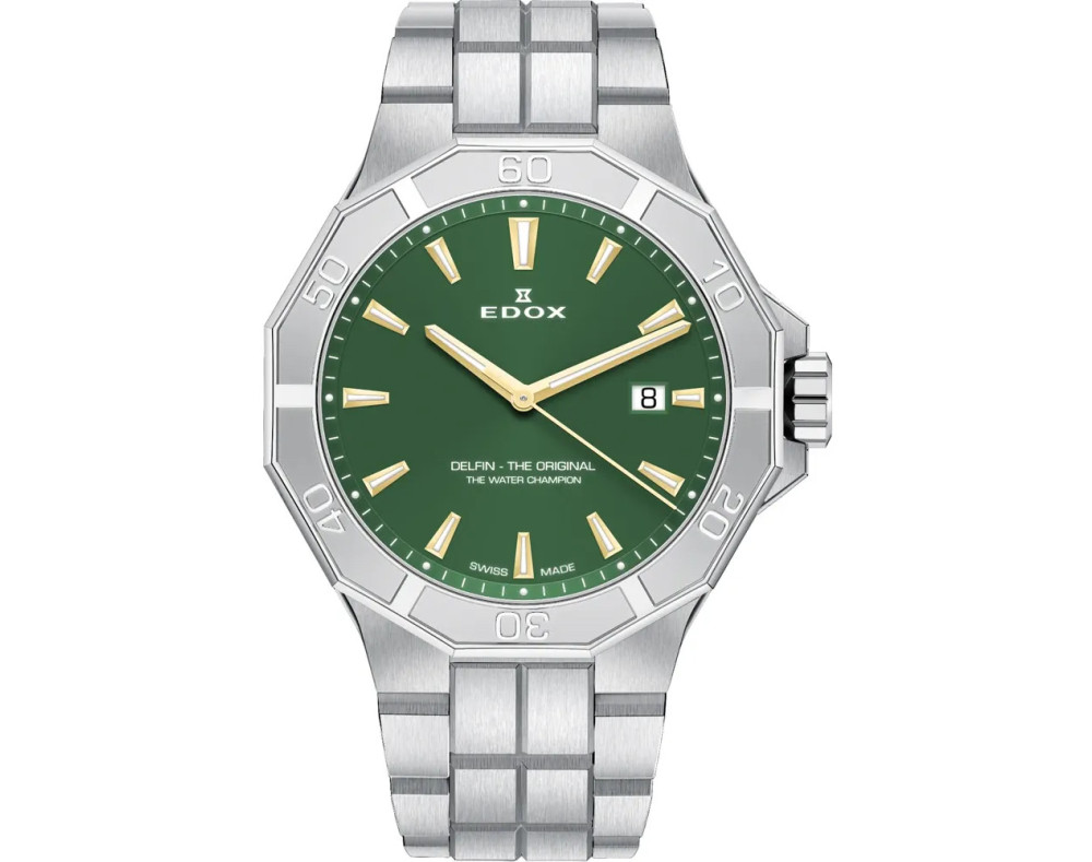 Quartz Man Wristwatch EDOX Delfin The Original 53021 3M VID with Stainless steel case, with diameter 43 mm, Green dial and Silver Stainless steel band.