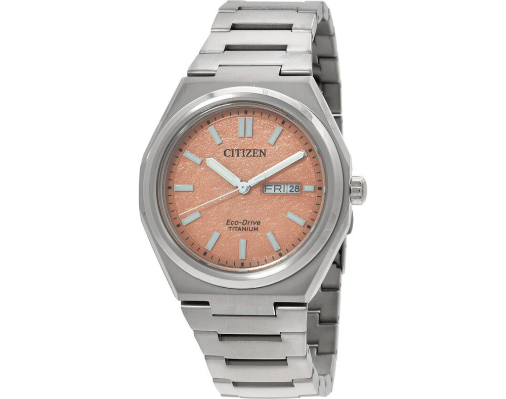 Quartz Man Wristwatch Citizen Eco-Drive AW0130-85Z with Titanium case, with diameter 40 mm, Pink dial and Silver Titanium band.