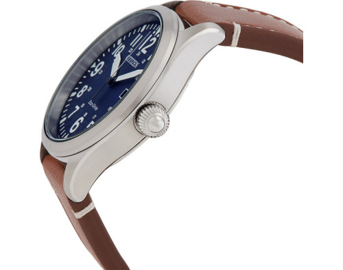 Quartz Man Wristwatch Citizen Garrison BM6838-17L with Stainless steel case, with diameter 42 mm, Blue dial and Brown Leather band.