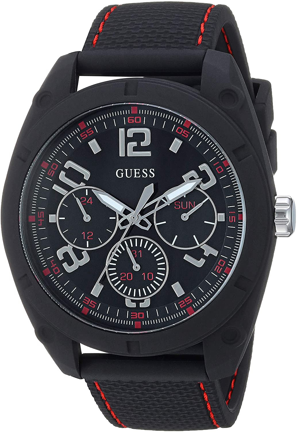 Kvarcas Vyras Rankinis laikrodis Guess U1256G1 su Plastmasinis dėklu, 46 mm skersmens, Mineralinis stiklas, Juoda ciferblatu ir Juoda Silikonas apyranke.