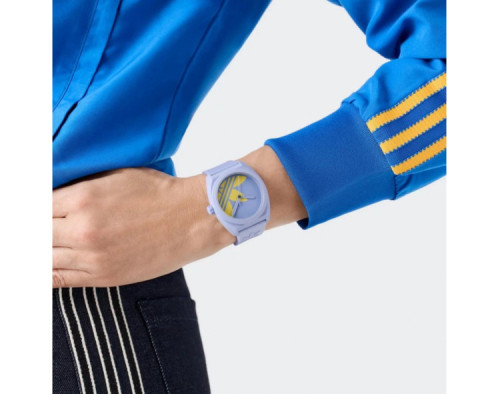 Kvarcas Unisex Rankinis laikrodis Adidas AOST25543 su Keramika dėklu, 44 mm skersmens, Mineralinis stiklas, Viola ciferblatu ir Viola Silikonas apyranke.
