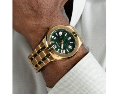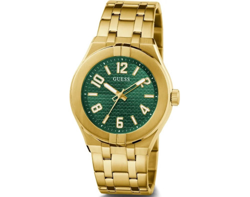 Kvarcas Vyras Rankinis laikrodis Guess GW0661G2 su Nerūdijantis plienas dėklu, 44 mm skersmens, Mineralinis stiklas, Žalias ciferblatu ir Auksas Nerūdijantis plienas apyranke.
