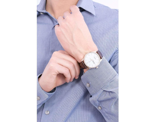 Kvarcas Vyras Rankinis laikrodis Citizen BM8553-16A su Nerūdijantis plienas dėklu, 42 mm skersmens, Mineralinis stiklas, Baltas ciferblatu ir Ruda Oda apyranke.