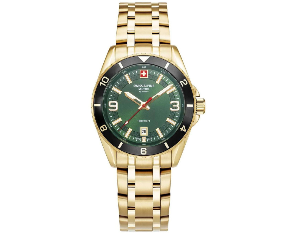 Кварц Мужчина Наручные часы Swiss Alpine Military SAM7034.1118, корпус Нержавеющая сталь, диаметр 42 mm, Минеральная стекло, Зеленый циферблат и Золото Нержавеющая сталь ремешок.