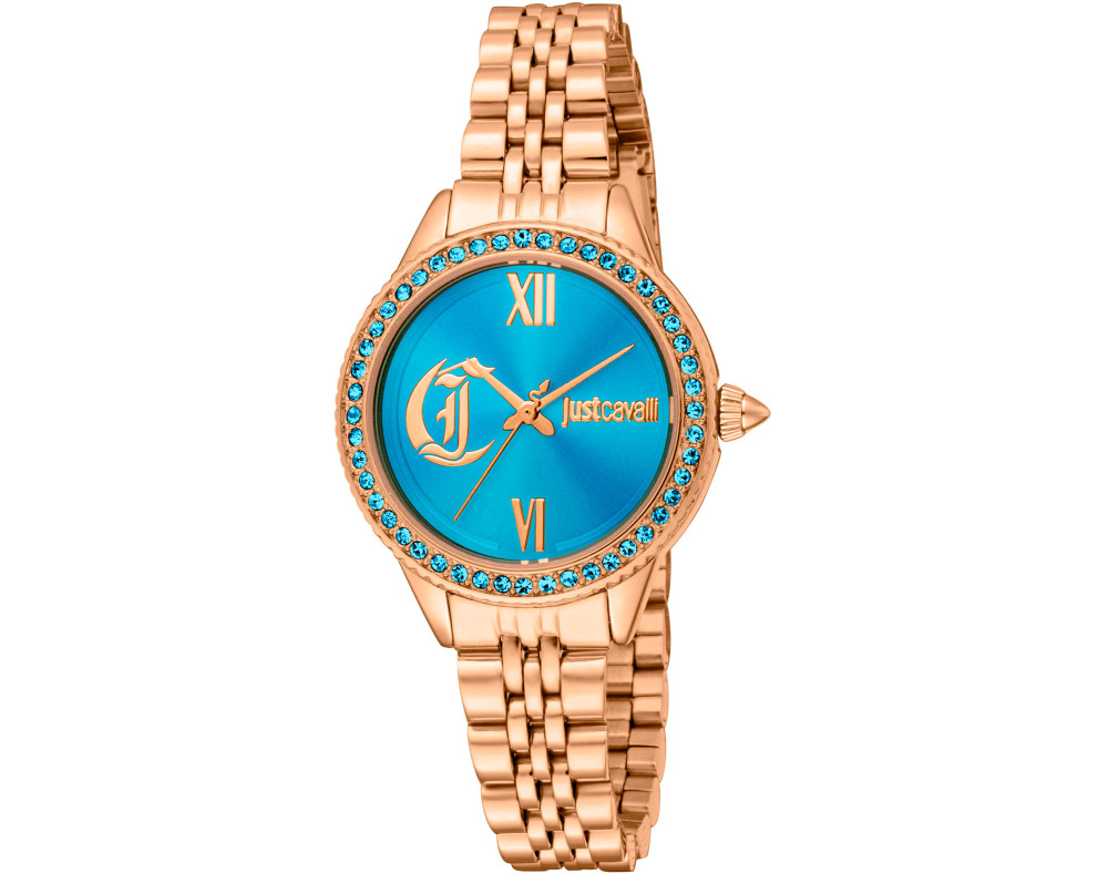 Кварц Женщина Наручные часы Just Cavalli JC1L316M0085, корпус Нержавеющая сталь, диаметр 30 mm, Минеральная стекло, Голубое небо циферблат и Розовое золото Нержавеющая сталь ремешок.