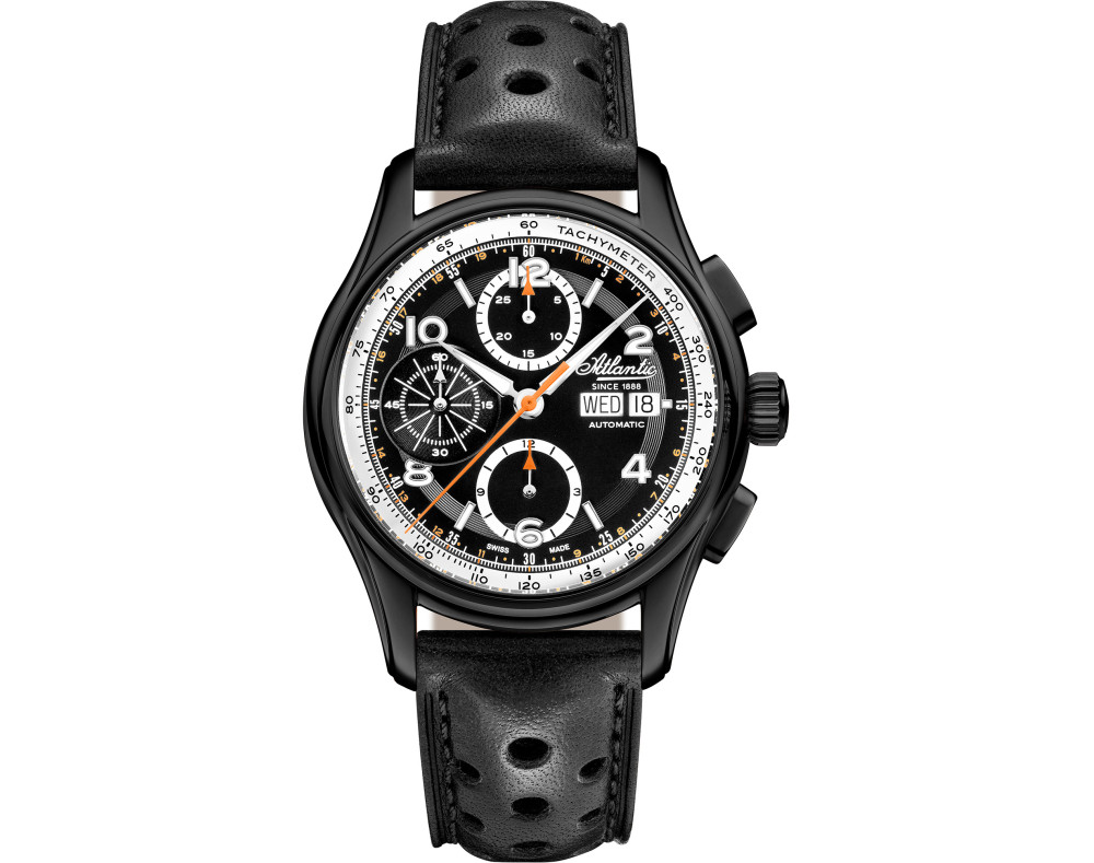 механический Мужчина Наручные часы Atlantic 55853.46.65, корпус Нержавеющая сталь, диаметр 42 mm, Минерал с обработкой сапфиром стекло, Черный циферблат и Черный Кожа ремешок.