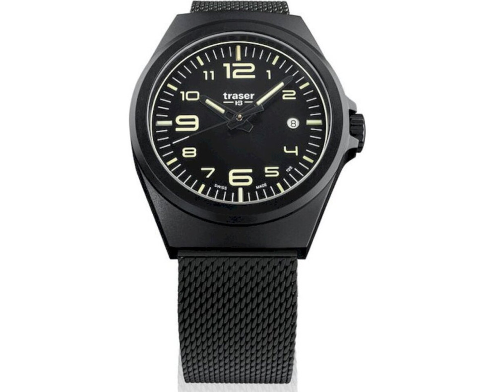 Кварц Мужчина Наручные часы Traser 108206, корпус Нержавеющая сталь, диаметр 42 mm, Минерал с обработкой сапфиром стекло, Черный циферблат и Черный миланская рубашка ремешок.