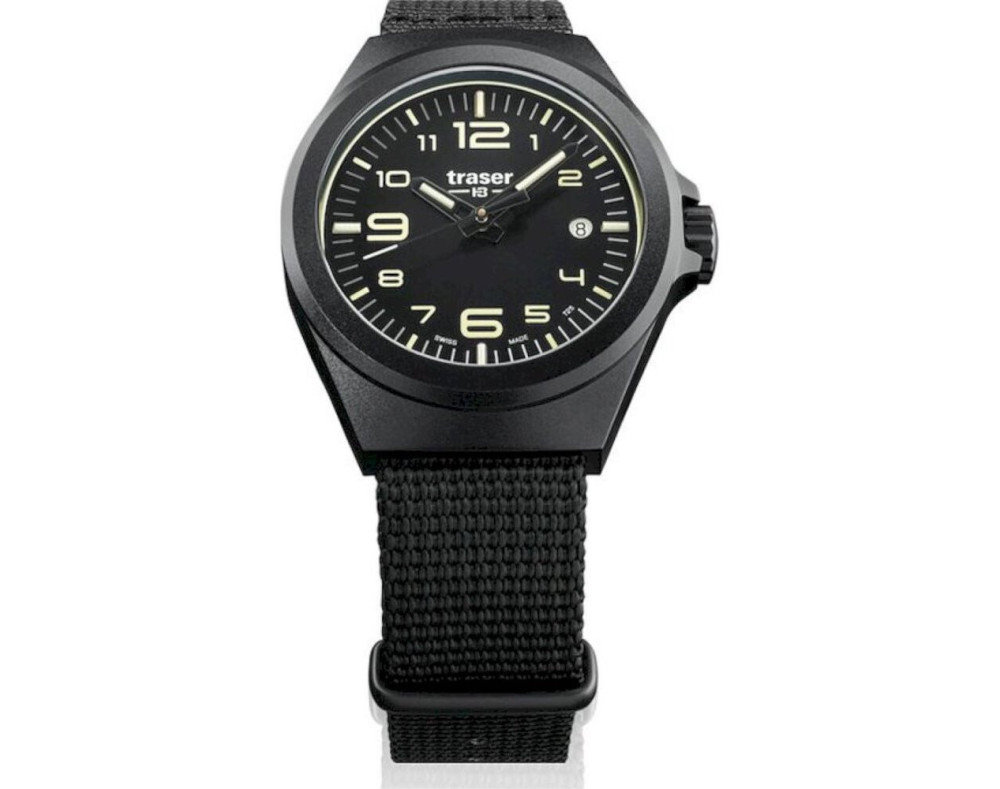 Кварц Мужчина Наручные часы Traser 108218, корпус Нержавеющая сталь, диаметр 42 mm, Минерал с обработкой сапфиром стекло, Черный циферблат и Черный Салфетка ремешок.