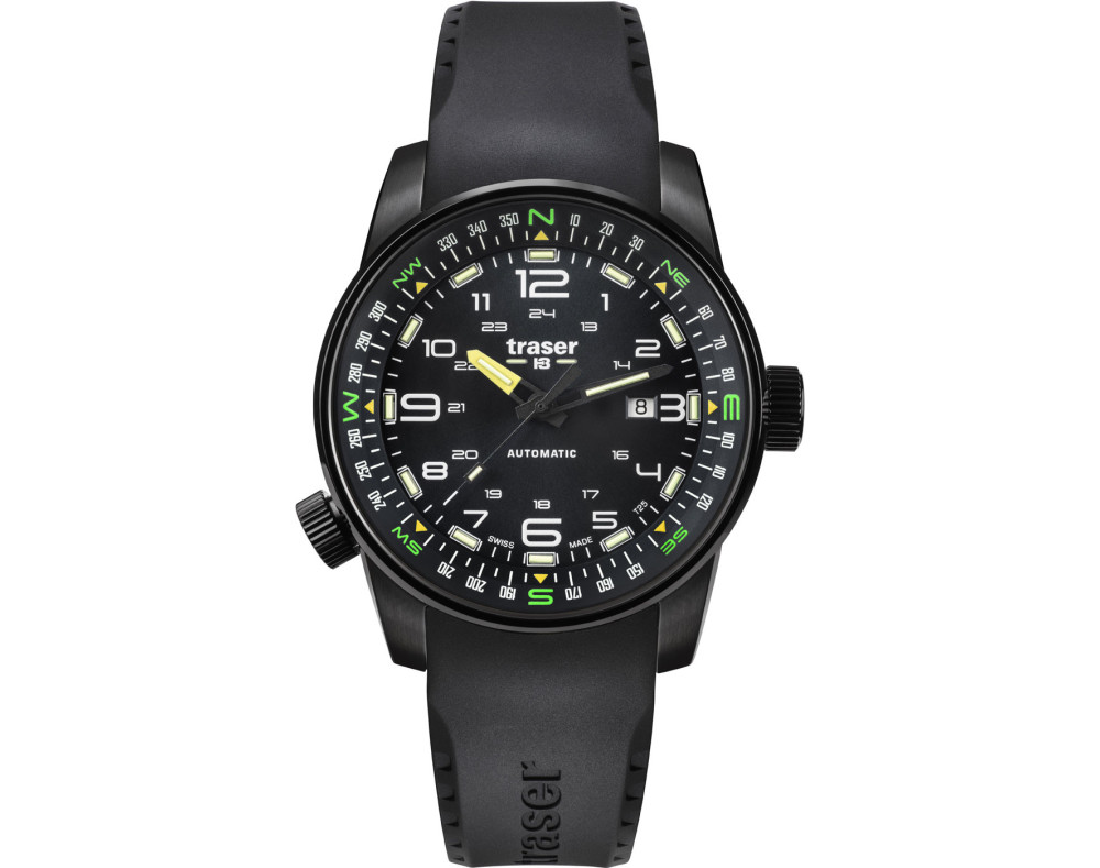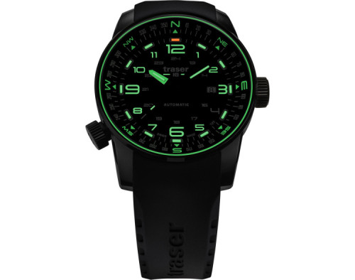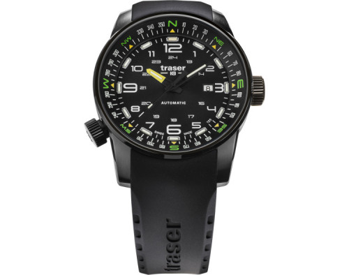 механический Мужчина Наручные часы Traser 109741, корпус Нержавеющая сталь, диаметр 46 mm, Минерал с обработкой сапфиром стекло, Черный циферблат и Черный Ластик ремешок.