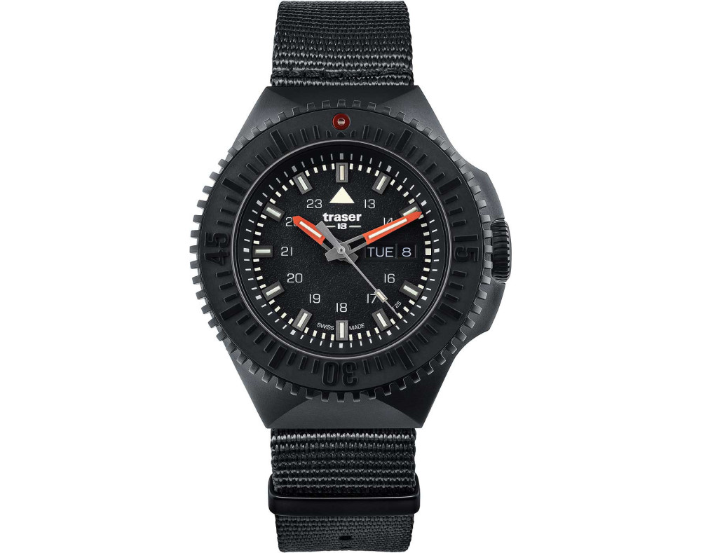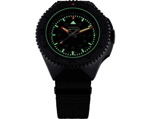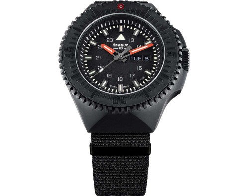 Кварц Мужчина Наручные часы Traser 109854, корпус Нержавеющая сталь, диаметр 46 mm, Минерал с обработкой сапфиром стекло, Черный циферблат и Черный Салфетка ремешок.