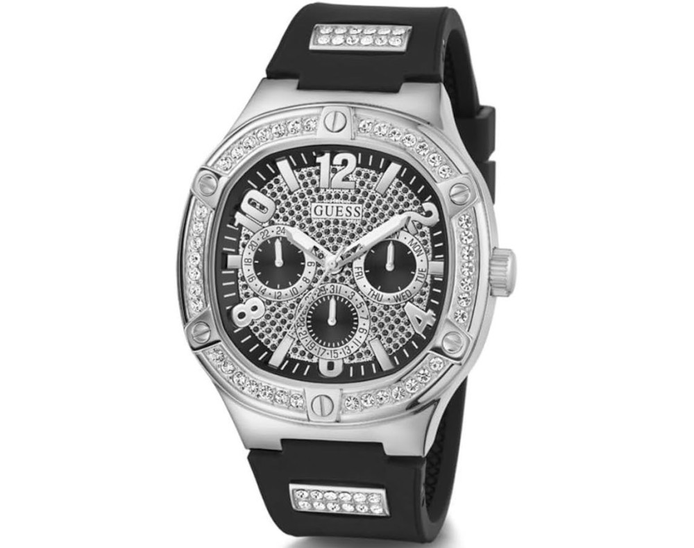 Кварц Мужчина Наручные часы Guess GW0641G1, корпус Нержавеющая сталь, диаметр 47 mm, Минеральная стекло, Серебро циферблат и Черный Силикон ремешок.