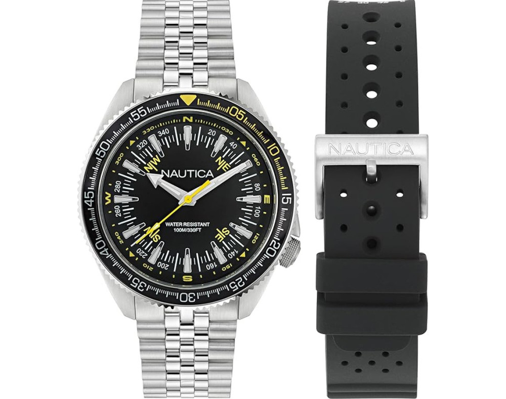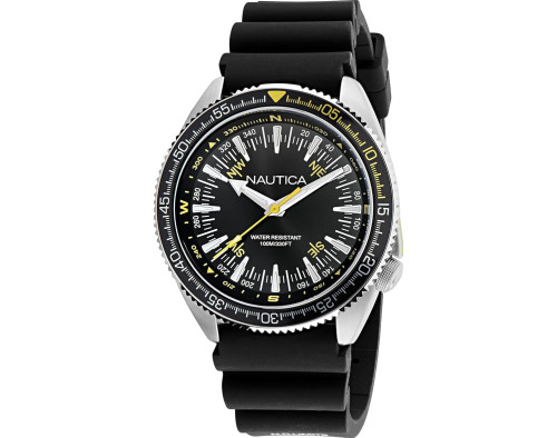 Кварц Мужчина Наручные часы Nautica NAPNVF303, корпус Нержавеющая сталь, диаметр 44 mm, Минеральная стекло, Черный циферблат и Серебро Нержавеющая сталь ремешок.