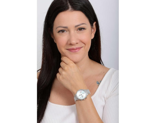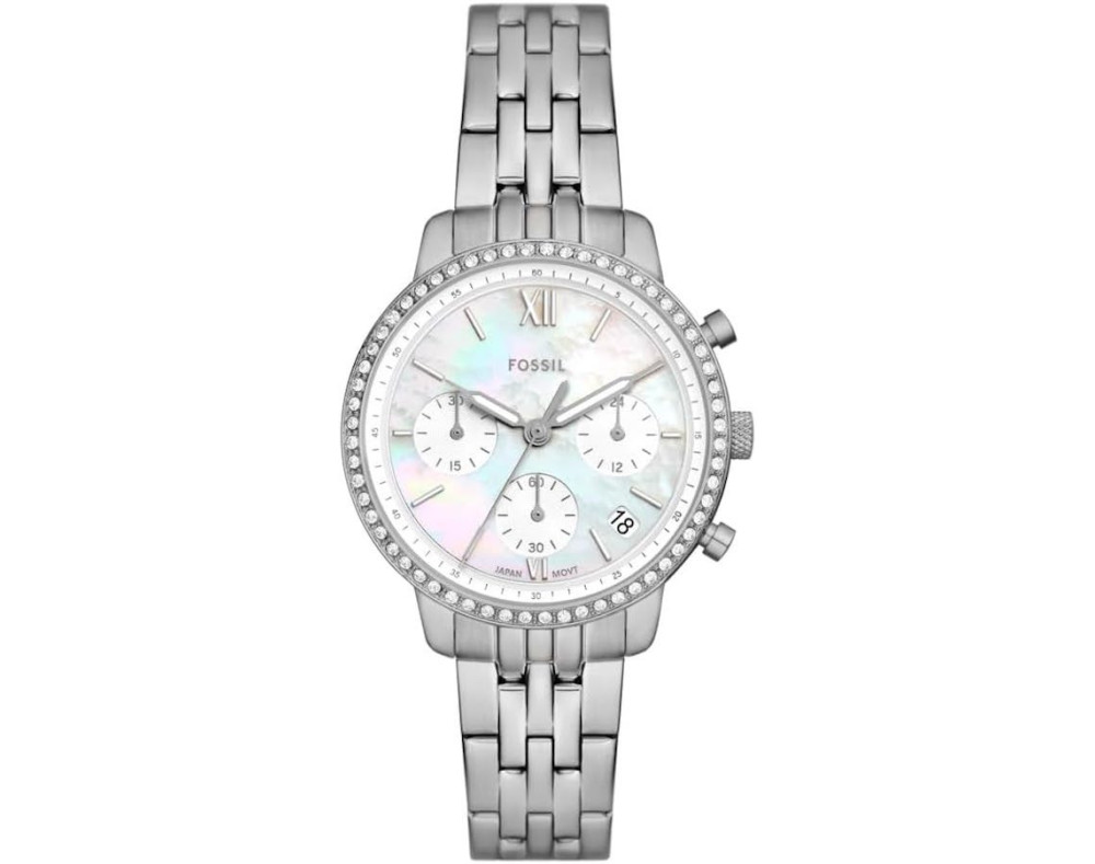 Quartz Womens Wristwatch Fossil Neutra ES5357 with Stainless steel case, with diameter 36 mm, Mother of pearl dial and Silver Stainless steel band.
