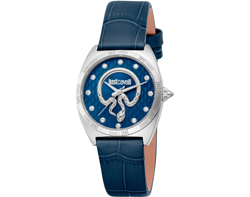 Quartz Womens Wristwatch Just Cavalli Mini Raffinata JC1L329L0015 with Stainless steel case, with diameter 30 mm, Blue dial and Blue Leather band.