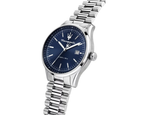 Orologio da polso Maserati Sorpasso R8853124004 Analogico Uomo con movimento Al quarzo, cassa in Acciaio inossidabile di diametro 42 mm, quadrante Blu, vetro Minerale e cinturino in Acciaio inossidabile di colore Argento.