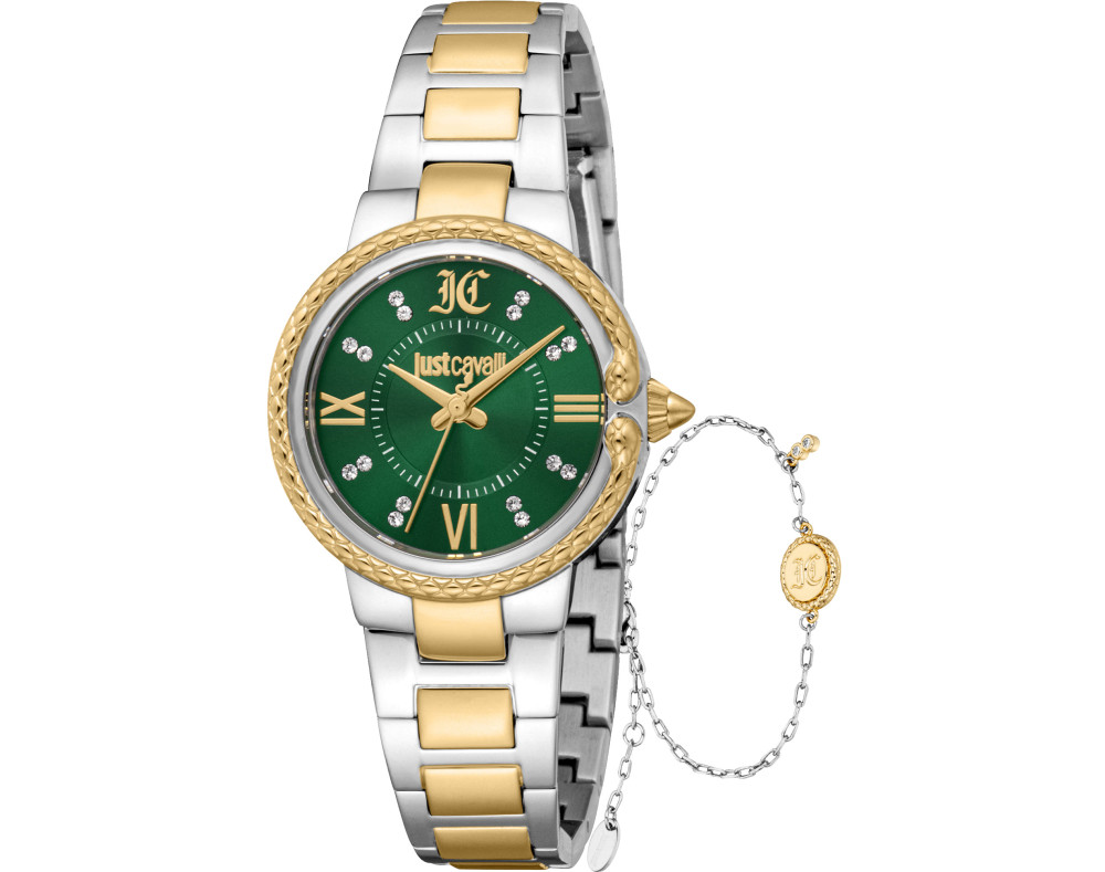 Kvarcas Moteris Rankinis laikrodis Just Cavalli JC1L378M0075 su Nerūdijantis plienas dėklu, 30 mm skersmens, Mineralinis stiklas, Žalias ciferblatu ir Dviejų atspalvių Nerūdijantis plienas apyranke.