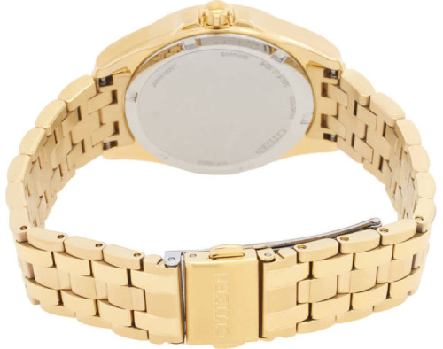Kvarcs Sieviete Rokas pulkstenis Citizen EO1222-50P ar Nerūsējošais tērauds korpusu, ar diametru 34 mm, Minerāls ar safīru apstrādi stikls, Zelts ciparnīcu un Zelts Nerūsējošais tērauds siksnu.