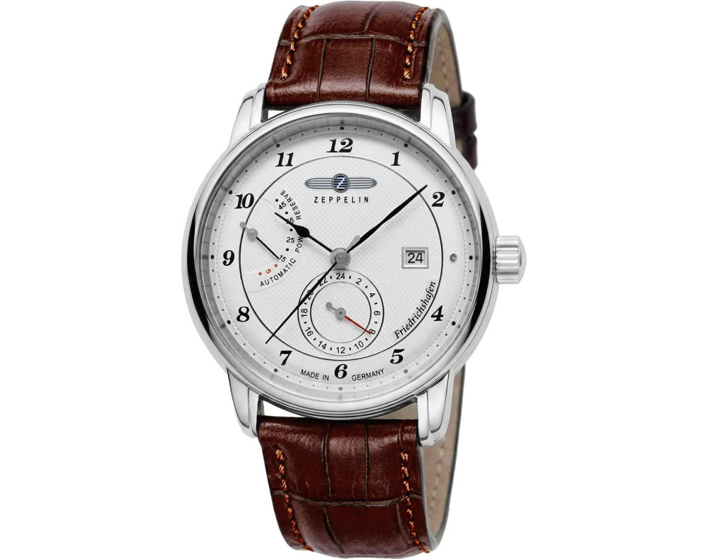 Mehānisks Cilvēks Rokas pulkstenis Zeppelin 8590-1 ar Nerūsējošais tērauds korpusu, ar diametru 42 mm, Minerāls K1 stikls, Sudrabs ciparnīcu un Brūns Āda siksnu.