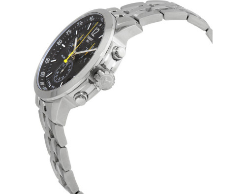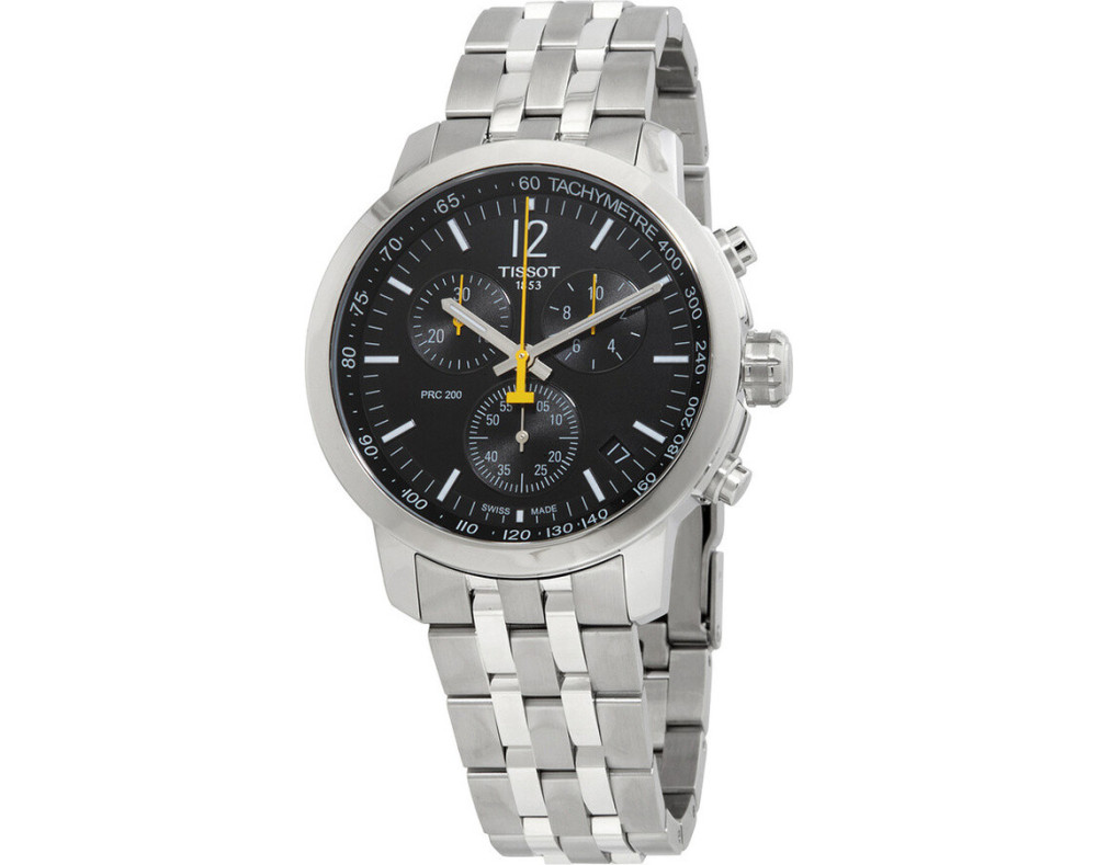 Kvarcs Cilvēks Rokas pulkstenis Tissot T114.417.11.057.00 ar Nerūsējošais tērauds korpusu, ar diametru 43 mm, Minerāls ar safīru apstrādi stikls, Melns ciparnīcu un Sudrabs Nerūsējošais tērauds siksnu.