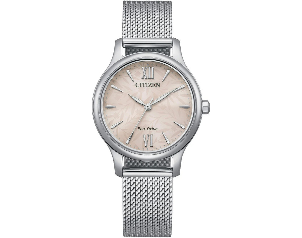 Kvarcs Sieviete Rokas pulkstenis Citizen EM0899-81X ar Nerūsējošais tērauds korpusu, ar diametru 31 mm, Minerāls stikls, Roze ciparnīcu un Sudrabs Milānas krekls siksnu.
