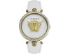 Armbanduhr Versace Palazzo VECO02022 für Damen mit Quarzwerk, Uhrengehäuse aus Edelstahl mit einem Durchmesser von 39 mm, Ziffernblatt Weiß und Uhrenarmband aus Leder in der Farbe Weiß.