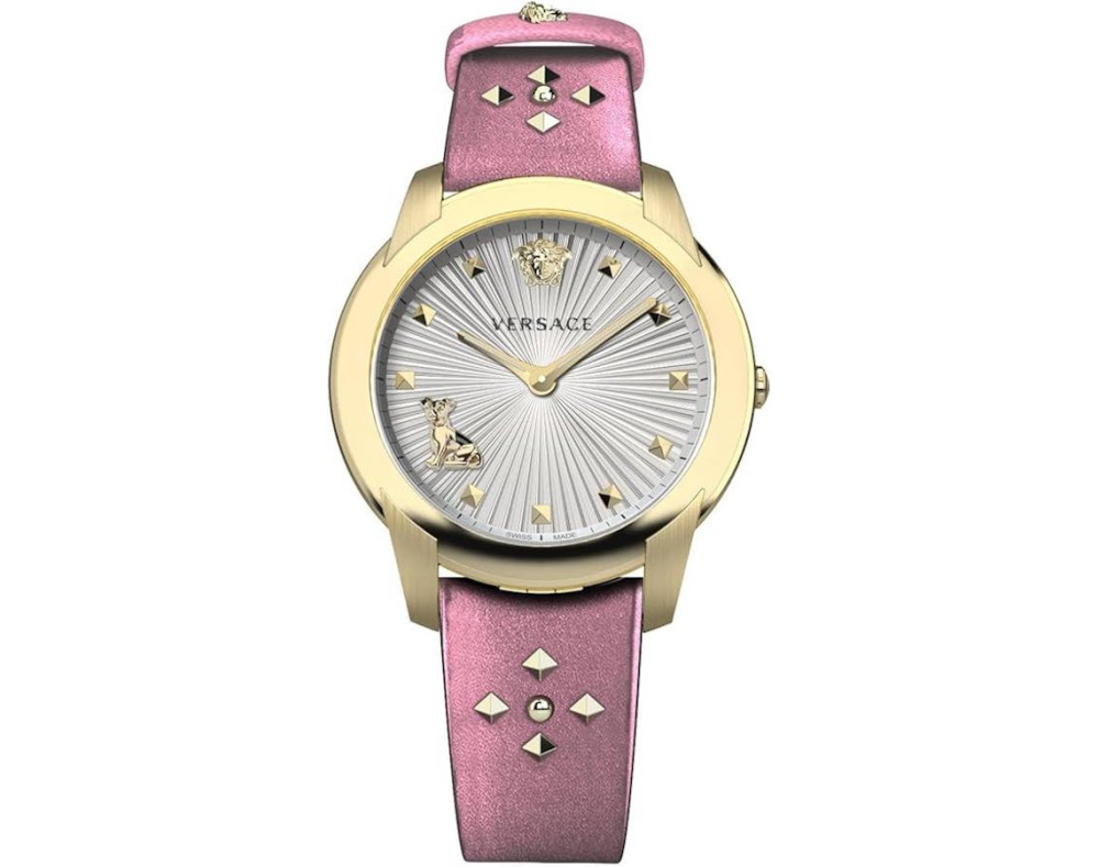 Armbanduhr Versace VELR01219 für Damen mit Quarzwerk, Uhrengehäuse aus Edelstahl mit einem Durchmesser von 38 mm, Ziffernblatt Grau und Uhrenarmband aus Leder in der Farbe Pink.