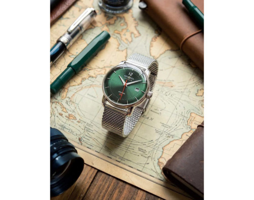 Armbanduhr Zeppelin LZ120 Bodensee 8160M-4 für Herren mit Mechanisch, Uhrengehäuse aus Edelstahl mit einem Durchmesser von 40 mm, Ziffernblatt Grün und Uhrenarmband aus Edelstahl in der Farbe Silber.