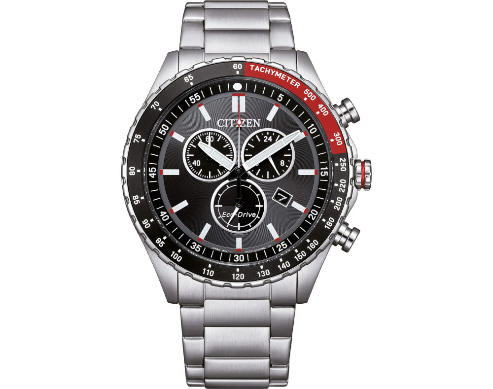 Armbanduhr Citizen Eco-Drive AT2566-88E für Herren mit Quarzwerk, Uhrengehäuse aus Edelstahl mit einem Durchmesser von 43 mm, Ziffernblatt Schwarz und Uhrenarmband aus Edelstahl in der Farbe Silber.