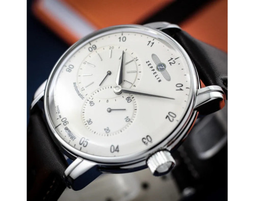Armbanduhr Zeppelin New Captain's Line 8662-5 für Herren mit Mechanisch, Uhrengehäuse aus Edelstahl mit einem Durchmesser von 42 mm, Ziffernblatt Beige und Uhrenarmband aus Leder in der Farbe Braun.