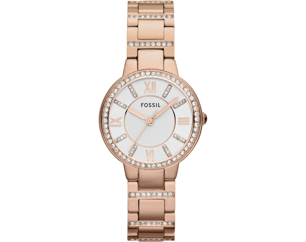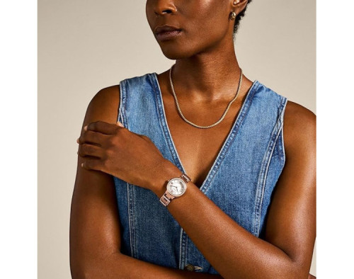 Kvarts Naine Käekell Fossil ES3284, Roostevaba teras korpusega, läbimõõduga 30 mm, Mineraal klaasist, Hõbedane sihverplaadi ja Roosa kuld Roostevaba teras rihm.