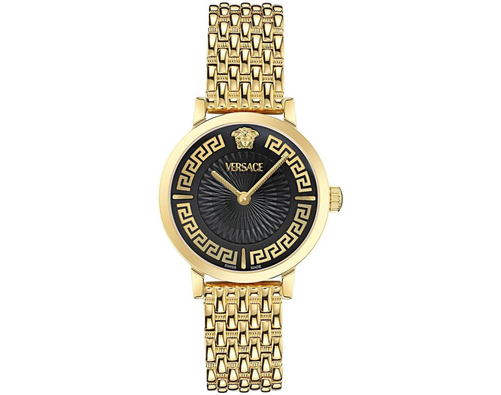 Kvarts Naine Käekell Versace VE0A00525, Roostevaba teras korpusega, läbimõõduga 35 mm, Safiiri töötlusega mineraal klaasist, Must sihverplaadi ja Kuldne Roostevaba teras rihm.