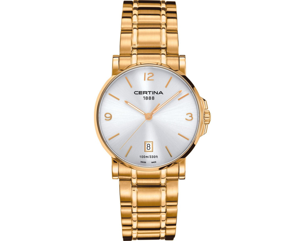 Kvarts Mees Käekell Certina C017.410.33.032.00, Roostevaba teras korpusega, läbimõõduga 38 mm, Safiiri töötlusega mineraal klaasist, Hõbedane sihverplaadi ja Kuldne Roostevaba teras rihm.